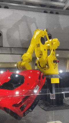 笔者拍到了FANUC最出名的R-2000系列,现场演示搬汽车,这个系列问世30年了,令人寂然起敬。