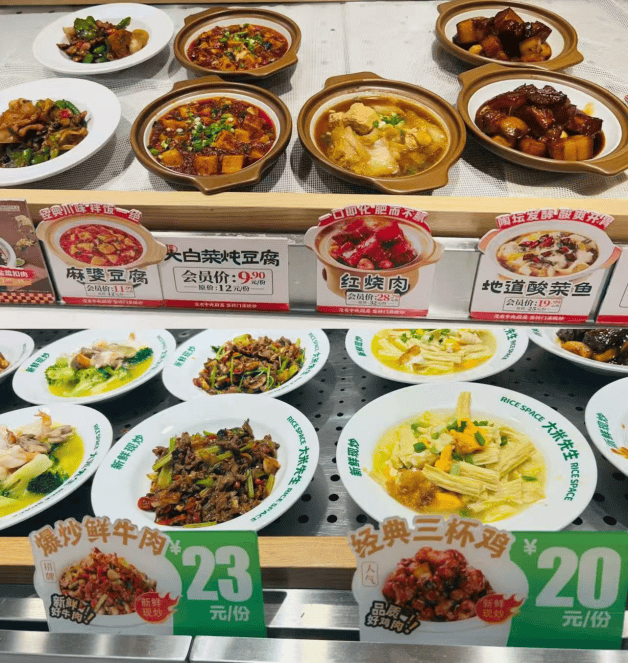 成心思演讲留意到,这三店结构雷同,内部可分为用餐区、选餐区和明厨区。正在选餐区,现炒菜品被分为蒸菜、荤菜、素菜和从食,门客同一手拿托盘,自行选择小碗菜,最初再一路结账。